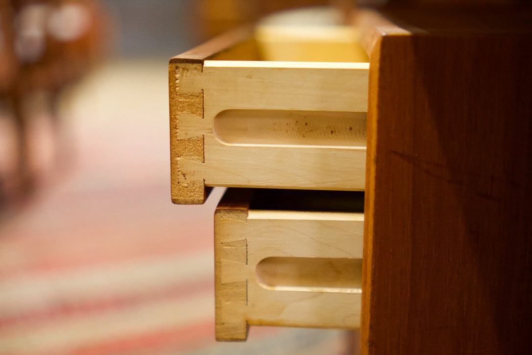 このデスクは、彼の哲学そのままに、清潔感あふれる直線と繊細な仕上げを融合させています。ローズウッドやチークを用いた中でも、天板の繊細な浮遊構造や、収納構成の美しさは特筆に値し、当時から現在に至るまでコレクターから高い評価を受け続けています。