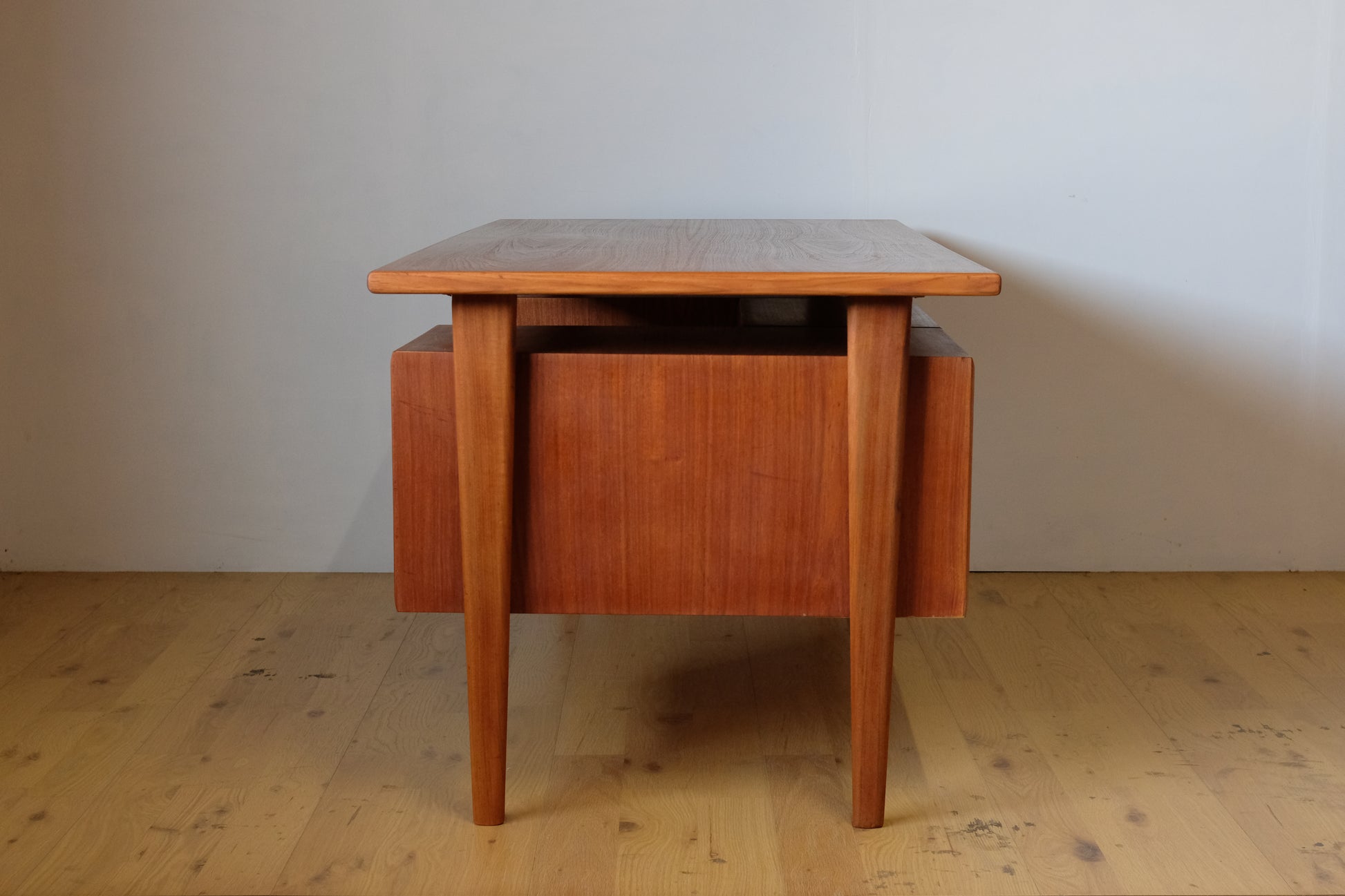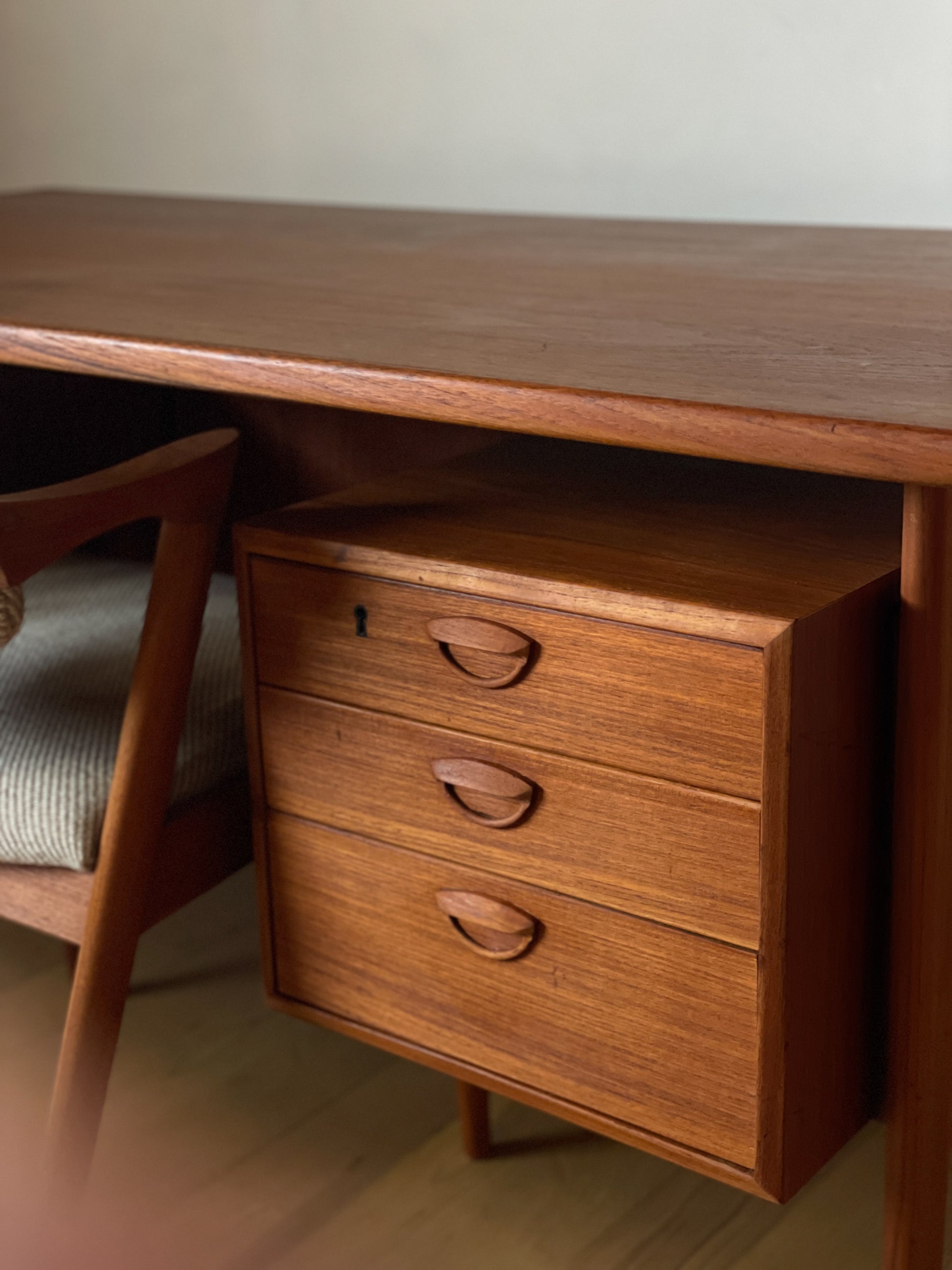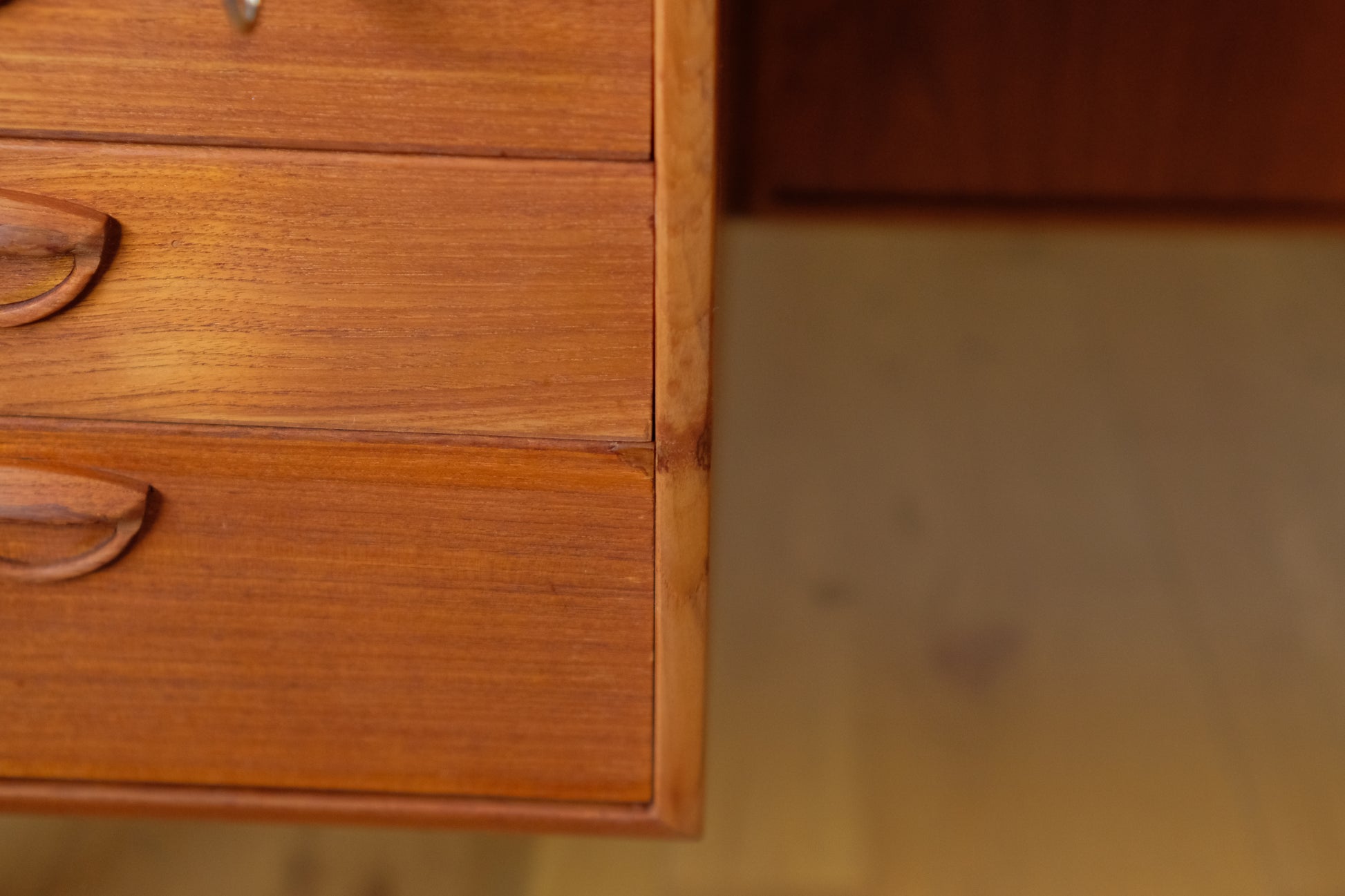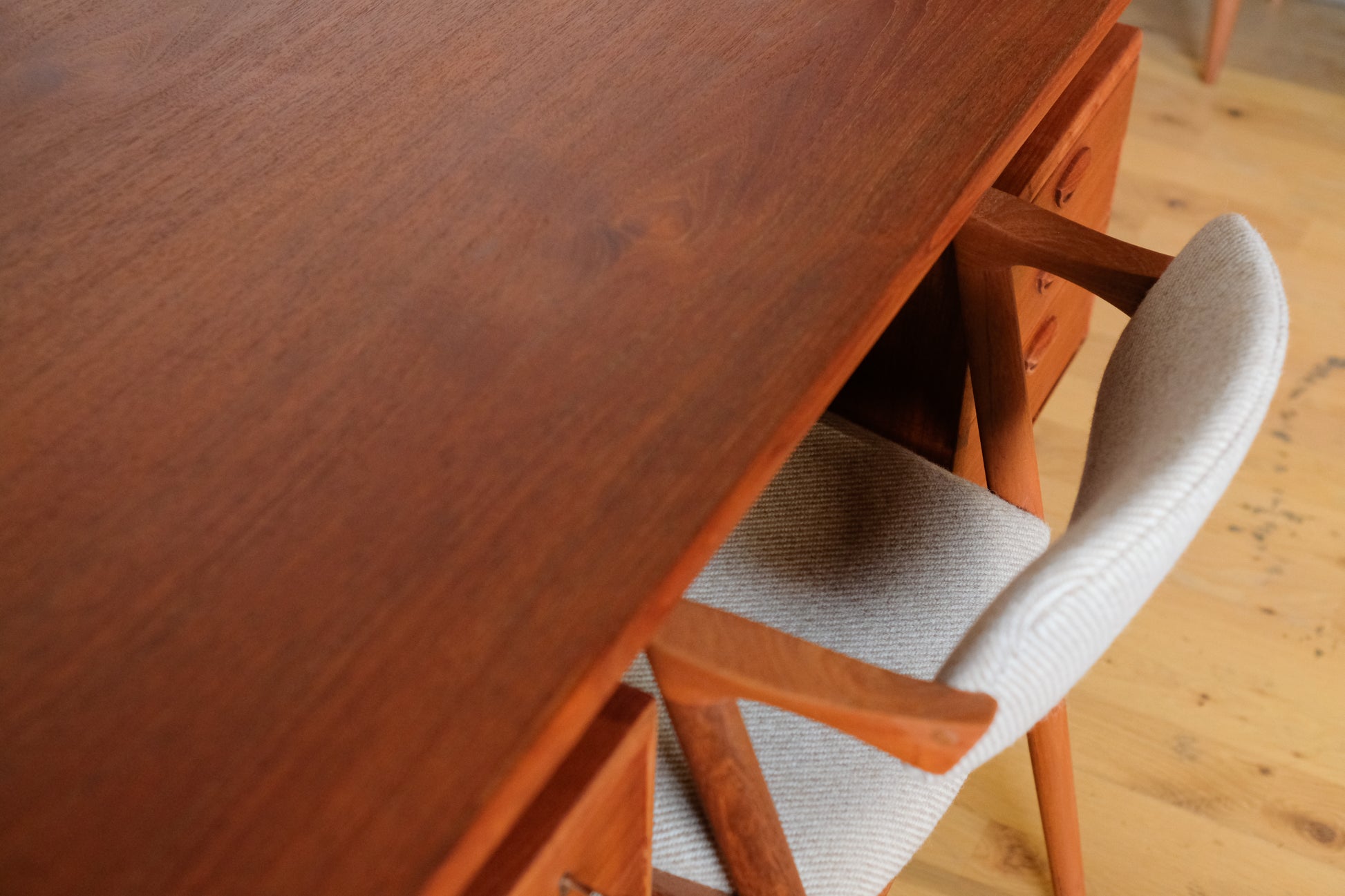ワークスペースを、洗練された北欧モダンの空間へ。デンマーク人デザイナー、Kai Kristiansenが1960年代に手がけたこのヴィンテージデスクは、チーク材を贅沢に使用し、浮遊感のある天板デザインと左右に配された収納により、機能と美を見事に両立。使い込むほどに艶を増す木目は時を越えて輝き、書き物やデスクワークを日常から特別なひとときへと昇華します。日本の暮らしにも溶け込む温かみと、空間に凛とした存在感を。60年代北欧の名品が、あなたの暮らしに新たなストーリーを刻みます。