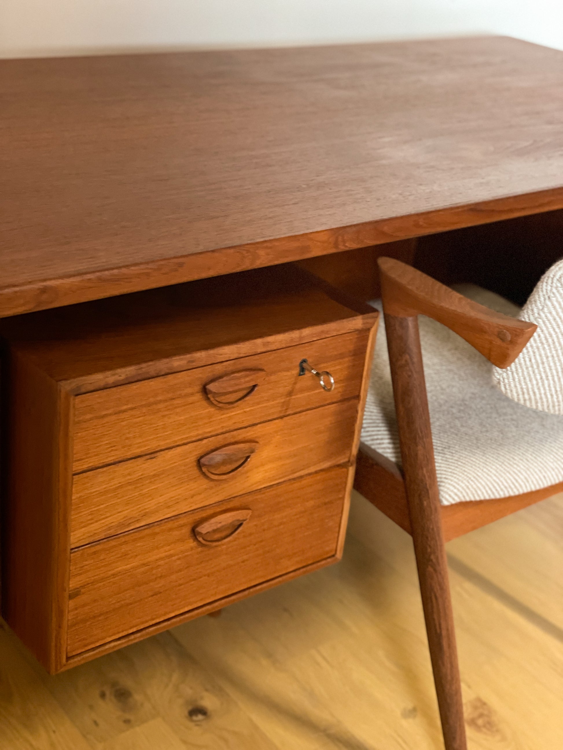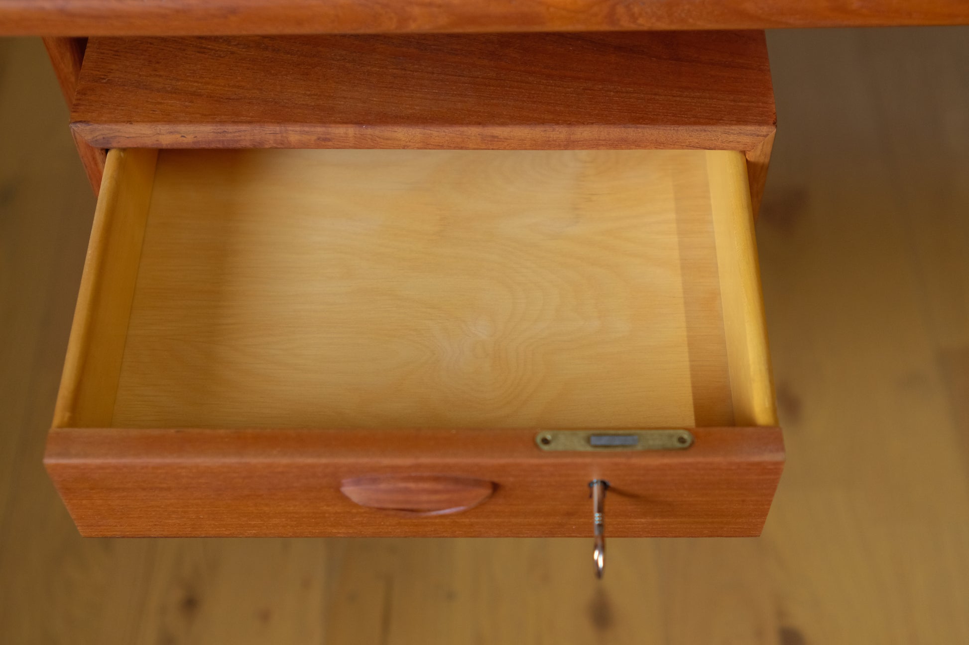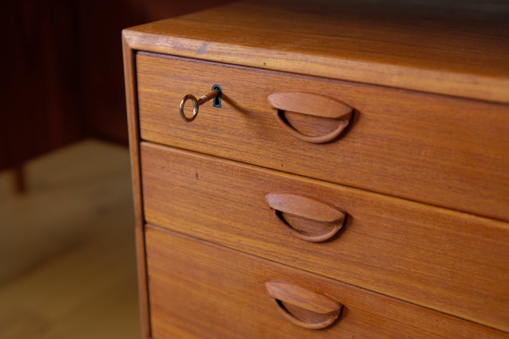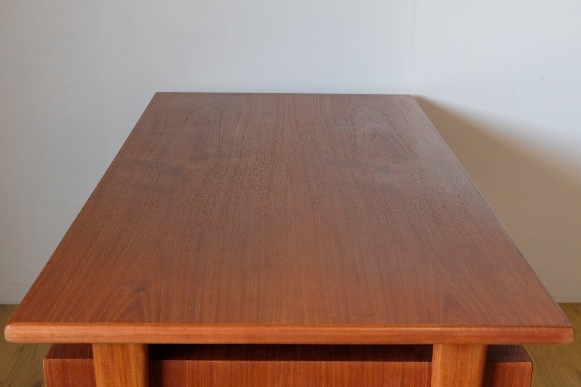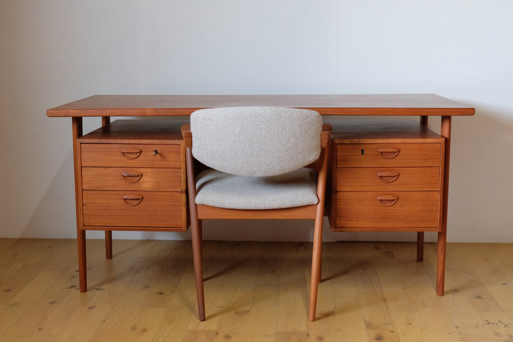 ワークスペースを、洗練された北欧モダンの空間へ。デンマーク人デザイナー、Kai Kristiansenが1960年代に手がけたこのヴィンテージデスクは、チーク材を贅沢に使用し、浮遊感のある天板デザインと左右に配された収納により、機能と美を見事に両立。使い込むほどに艶を増す木目は時を越えて輝き、書き物やデスクワークを日常から特別なひとときへと昇華します。日本の暮らしにも溶け込む温かみと、空間に凛とした存在感を。60年代北欧の名品が、あなたの暮らしに新たなストーリーを刻みます。