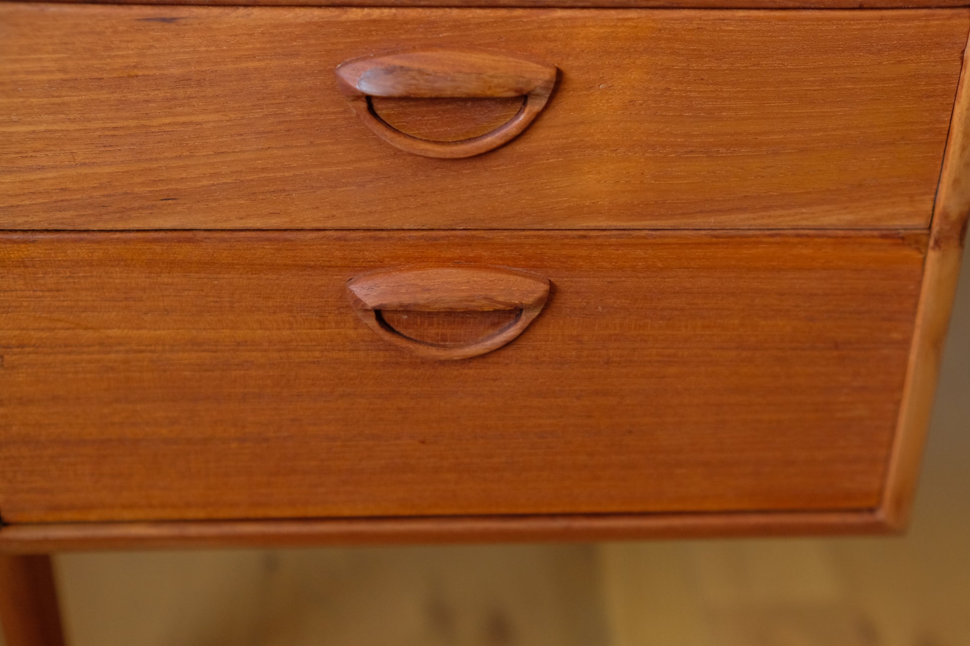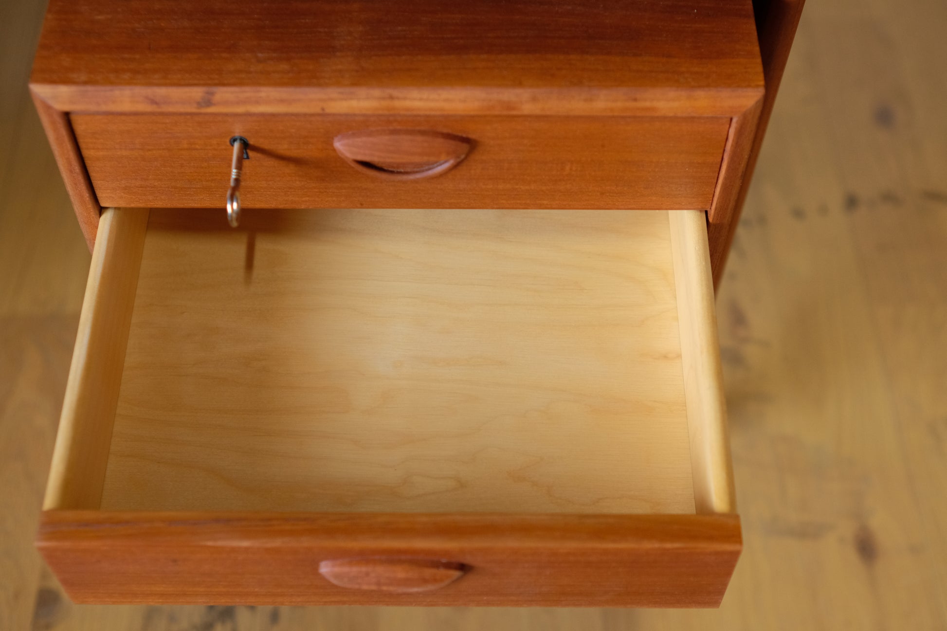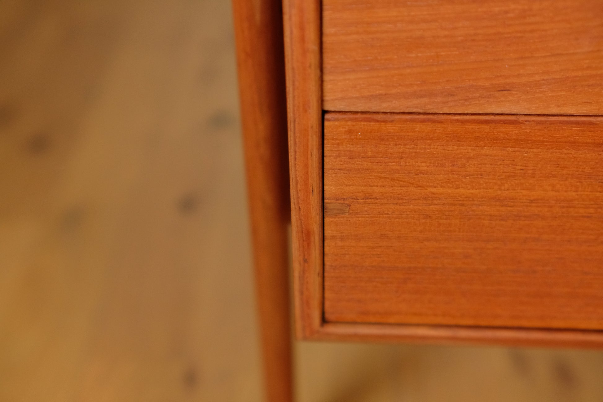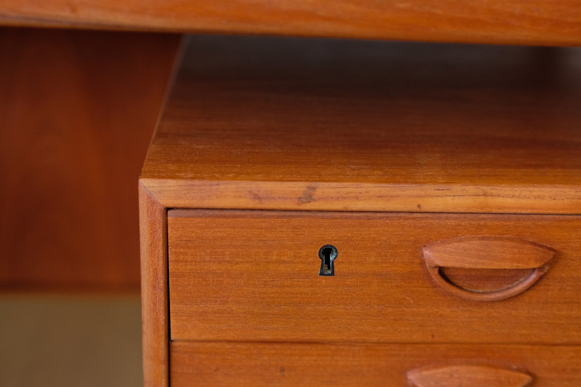 ワークスペースを、洗練された北欧モダンの空間へ。デンマーク人デザイナー、Kai Kristiansenが1960年代に手がけたこのヴィンテージデスクは、チーク材を贅沢に使用し、浮遊感のある天板デザインと左右に配された収納により、機能と美を見事に両立。使い込むほどに艶を増す木目は時を越えて輝き、書き物やデスクワークを日常から特別なひとときへと昇華します。日本の暮らしにも溶け込む温かみと、空間に凛とした存在感を。60年代北欧の名品が、あなたの暮らしに新たなストーリーを刻みます。